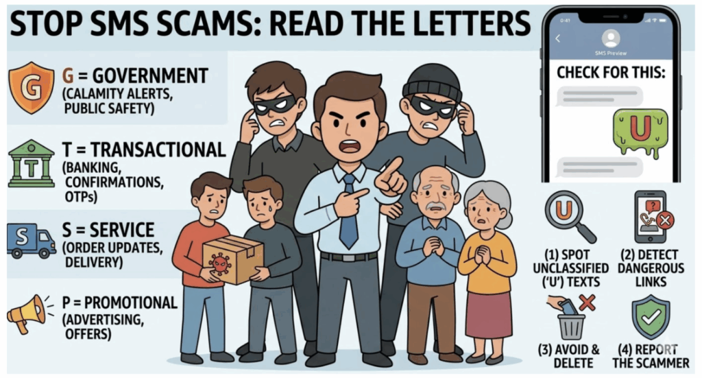 An SMS ending with S represents a service-related message and is commonly sent by brands and service providers such as telecom companies or e-commerce platforms like Amazon and Flipkart to update users about orders, deliveries, or active services. Messages ending with P denote promotional content and are typically marketing communications featuring product advertisements, clothing deals, educational loan offers, or college admissions. Identifying these letters also helps users detect potential scams, as fraudulent messages usually do not follow standard SMS classification rules. Although the absence of these alphabets does not guarantee a scam, it serves as an early warning sign, encouraging users to remain cautious when interacting with unknown links or suspicious content.